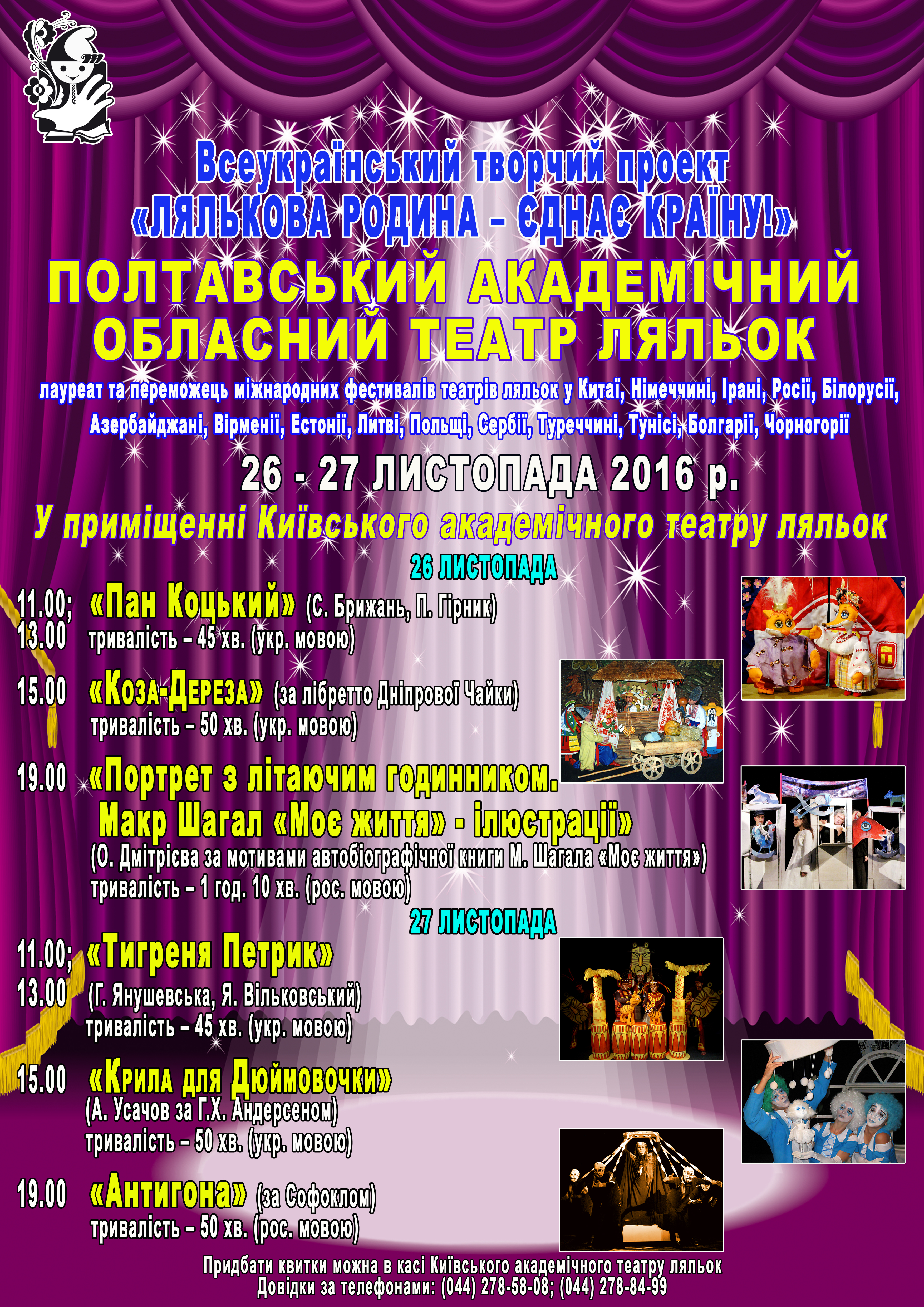 26 - 27 листопада Київський академічний театр ляльок покаже на своїй сцені вистави Полтавського академічного обласного театру ляльок, а саме, чотири вистави для дітей та дві для дорослих в програмі Всеукраїнського творчого проекту "Лялькова родина - єднає країну!"